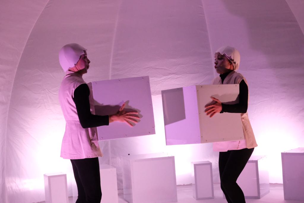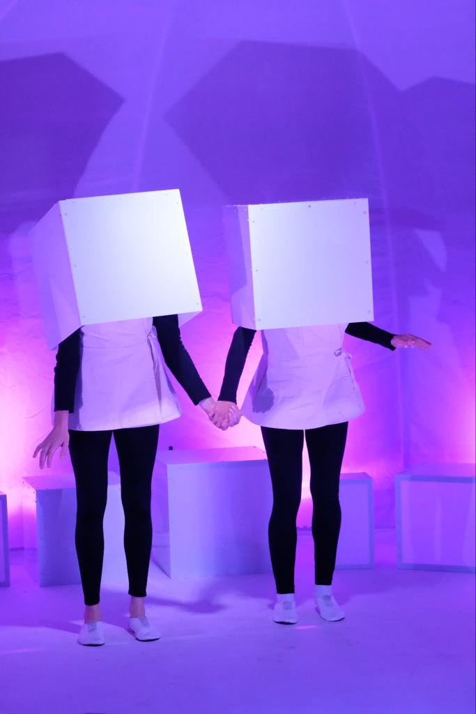 De cette vie en gestation naît un petit être nommé PETIT. Constitué d’air, de savon et d’eau, PETIT évoque la naissance de la vie, sa croissance, ses métamorphoses. Il grandit mais reste fragile et éphémère. Une bulle prête à s’envoler. Peu à peu, son corps se dessine, des pieds pour avancer, une tête pour penser. PETIT découvre son enveloppe de mousse et cherche à habiter ce corps qui le compose et devenir fort comme les autres. Accompagner un être qui vient au monde est une aventure bouleversante. Deux personnages, complices et espiègles, se lancent dans ce défi. Apprendre, ensemble, à devenir les garants d’une vie. Leur lien avec PETIT révèle l’importance de l’amitié, de l’attention, de l’apprentissage mutuel.