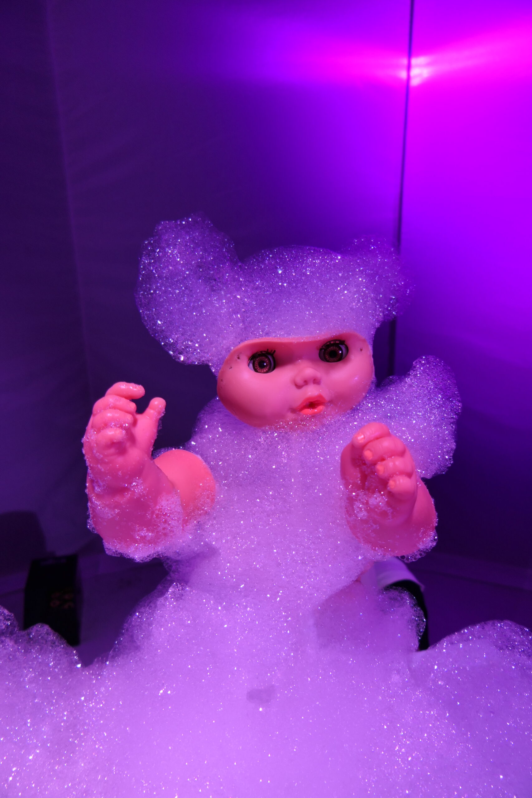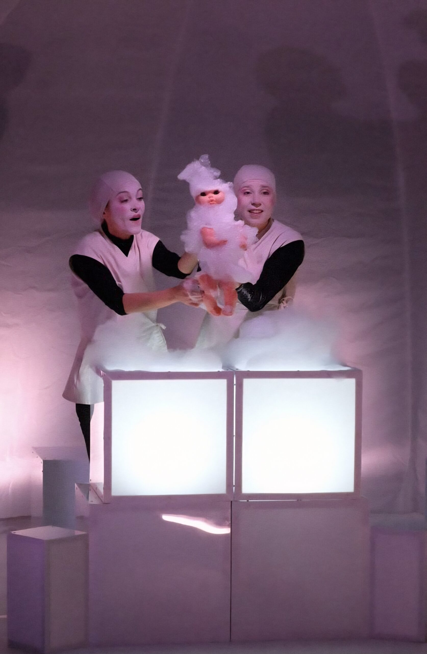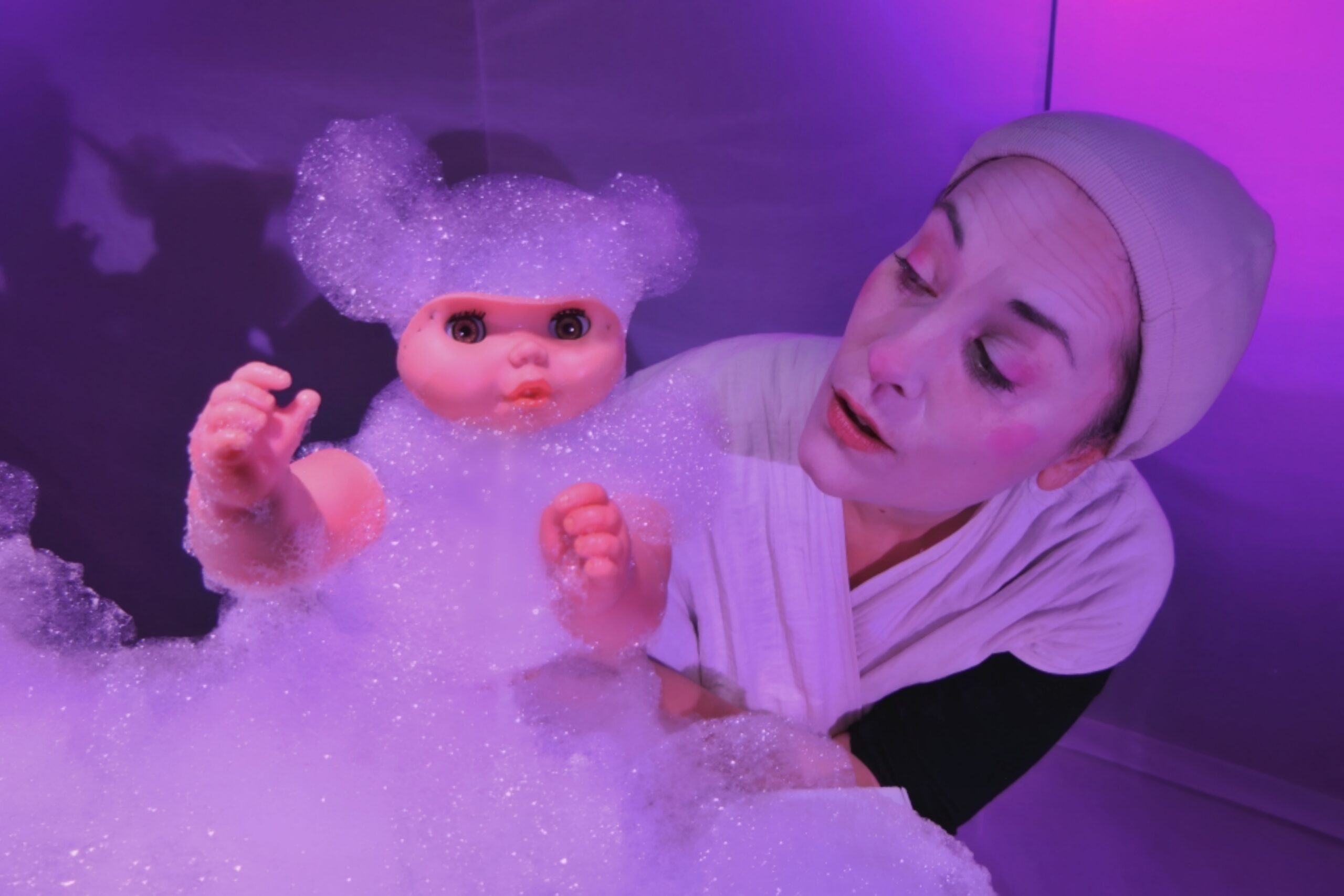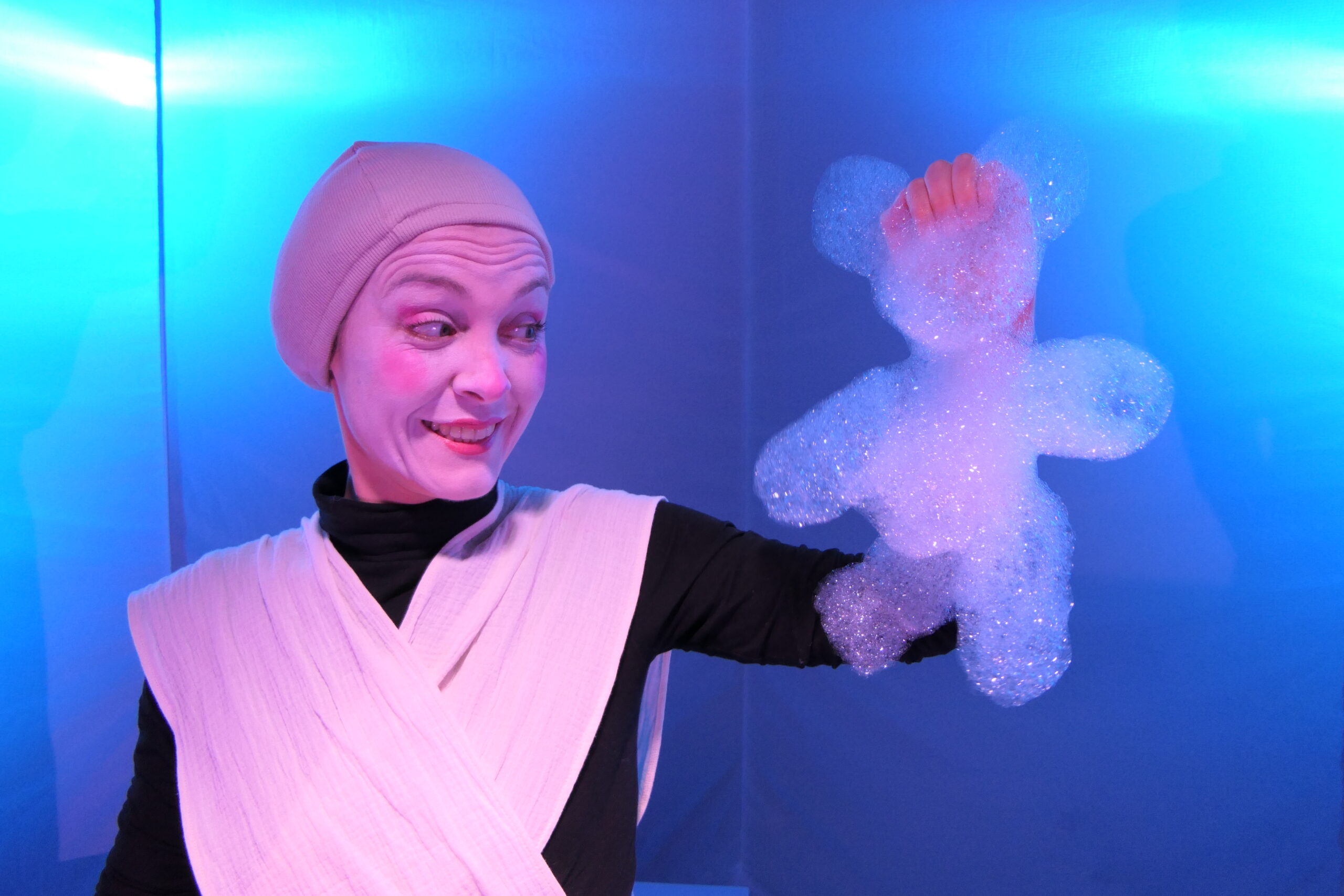 Un spectacle sensoriel, visuel, de matière avec de la mousse de savon, des marionnettes, projections lumineuses et théâtre d’objet.